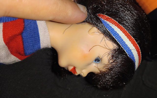 His head is rock hard and one arm is loose which is in keeping with him being a mini doll. The story goes that the factory fucked up their mixture when they made the soft vinyl parts and they shrank more than expected and hardened up. The end result is a doll with a small rock hard head and often similarly rock hard arms none of which fit into the body correctly. Wobbly heads are a defining feature of these dolls but Pedigree had a waste nothing policy so they sold them anyway. What's not entirely clear is where in the process the factory realised they'd screwed up. But these dolls were still sent out to stores. One thing they do have going for them, despite their wonkiness, is that they tend to retain very very bright colouration and high blush.