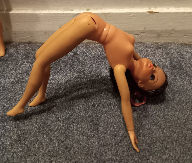 Meanwhile the blonde has the rivet arms, but a standard active waist and the legs without bending ankles. Also notice how she has no neck joint like the other ballerina? Yeah, this is I THINK the "Lovely Lively" body, which uses ballerina arms and a torso that's a hybrid between the ballerina's elasticated waist (as opposed to the twist waist of standard dolls) and the normal body.